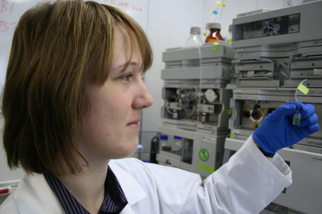 Strasburger-Preisträgerin Marion Eisenhut bestimmt Zwischenprodukte des Stoffwechsels in einer Blaualgen-Probe mit einer Hochleistungs-Flüssigkeits-Chromatographie-Anlage (HPLC). Foto: Mika Keränen.